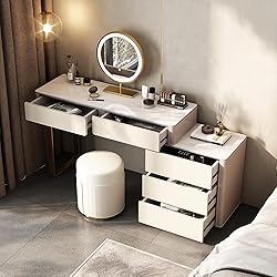 Selected thickened saddle leather: Surface paste with saddle leather handmade, delicate touch, tough and thick fine and meticulous car line, a needle and a line are involved in the delicate and soft leather life than the general cowhide is more durable, the appearance and feel the same as genuine leather Snow Mountain Stone-Glossy Rock Slab From the natural rock of the high mountains, fired by 1200°C, more high temperature resistance, anti-penetration, acid and alkali resistance, easy to clean and other characteristics. The product is set up so the left and right can be installed, the left and right are reserved holes Adjust the direction of the dressing table as you wish regardless of the size of your home. Can also be placed at a 90° angle to meet the different types of house. Free movement and flexible expansion, make-up and office both convenient Intelligent point and click.High-definition makeup mirror, mapping every detail, 360 non-shaped light evenly illuminated farewell to the lack of light, easy to create a clean makeup look Ample storage space: 5 oversized drawers, for your jewelry, skincare, and beauty products. Tall stainless steel load bearing feet Stable and strong load-bearing capacity, stainless steel surface plating process, corrosion-resistant, anti-oxidation, easy to clean
