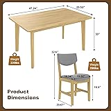 - Create a cozy dining space with this rustic 5-piece set featuring a solid wood table and upholstered chairs. Perfect for kitchen or dining room use, this farmhouse-style furniture offers minimalist design and ergonomic comfort. Appearance:The table features a smooth, solid wood top with gently rounded edges and slender, tapered legs that enhance its light, airy profile. Each chair combines a curved, ergonomic backrest with a streamlined frame, and the gray fabric’s textured weave adds visual depth without overwhelming the set’s minimalist vibe. Versatile Scenarios:This set is ideal for everyday family meals, casual weekend brunches, or small dinner parties with friends. Its compact footprint (thanks to the table’s 47.24-inch length) works well in apartment dining nooks, while its sturdy build can accommodate regular use in larger family kitchens. Functional Features:The padded chair seats and backrests provide ergonomic support, reducing discomfort during long meals or conversations. The solid wood table surface is easy to clean: spills can be wiped away quickly, and the fabric cushions are stain-resistant . The set’s lightweight yet stable constructionalso makes it easy to rearrange, whether you’re reconfiguring the dining space or moving the chairs for additional seating elsewhere in the home.