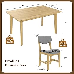 **Sturdy Construction**: Solid wood table with 330lbs weight capacity and upholstered chairs supporting up to 250lbs each. **Versatile Styling**: Choose from natural, walnut, or espresso finishes to suit various decor styles. **Ergonomic Design**: Curved backrests and padded seats for comfortable dining experiences. **Easy to Clean**: Wipeable table surface and stain-resistant fabric cushions for hassle-free maintenance. **Compact & Lightweight**: Perfect for small spaces and easy to rearrange for different seating arrangements.