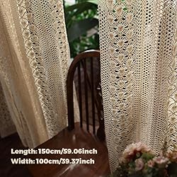 - Description: Transform your living space with our stunning Crochet Curtains! Each panel measures 39.37x59.06 inches, showcasing a vintage boho lace design that adds an elegant touch to your home. Crafted from stable materials, these hollow-out lace curtains gracefully filter light while providing privacy, making them ideal for living rooms, bedrooms, or dining areas. The neutral beige color complements a variety of decor styles, from farmhouse to contemporary, enhancing your interior with a chic, refined look. Easy to install, these macrame curtains provide a simple yet effective way to refresh your windows and create an inviting, warm environment in of your home. Features:. Crochet Curtains. -Color: Beige. -Material: Cotton Linen. -Size: about 100x150 cm/39.37x59.06 inch. Note: Manual measurement, please allow slight errors in size. The colors may exist slight difference due to different screens. Warning: These crochet curtains are designed for indoor use only and should be handled with care. Do not use near open flames or heat sources. Keep out of reach of children. Package Including 1 Panel Crochet Curtains