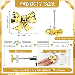【Elegant Design】:These gold cabinet knobs is made of zinc alloy solid, our cabinet knobs offer reliable strength and long-lasting performance without fading or chipping.these drawer knobs feature exquisite bow designs, adding a vintage charm and elegance , showing your unique fashion. we replaced the screws with professional household screws; We provide four sizes of screws for each package, allowing you to select the closest size for a perfect fit without the need for additional trimming. 【Applicable To】:Decorative Bow Knobs Drawer Pullsfeature an elegant gold tone that fully enhances the aesthetic appeal of your drawers or cabinets; Its sleek design and fashionable look are sure to add a touch of elegance and sophistication to any room .These modern furniture handles are ideal for cupboard, door and drawer in the kitchen,living,bedroom cabinet,wardrobe, closet,garage,bar,dresser,room,bathroom and dining area cabinet handles. 【SIZE MEASUREMENT】 Drawer knobs Diameter 2.17"(55.0MM); Height: 1.77"(45.0MM);4 size screw Available options: 0.86"(22MM)&1"(25MM) & 1.38"(35MM)&1.77"(45MM) screws ( The corresponding thicknesses of the wooden boards are :0.5"(13MM)&0.6"(16MM)&1"(26MM)&1.42"(36MM);please check the size you need before purchase. 【 ELEGANT BRUSHED GOLD FINISH 】 The smooth brushed brass surface adds a timeless, luxurious touch to any room. Warm gold tones complement both modern and classic décor while resisting fingerprints and daily wear.Every kitchen drawer pulls dresser knobs for girls is individually wrapped and bagged prevent bumps and scratches to protect the beautiful color. 【TIMELESS GIFT】 Metal Knob sets are the finest option for gifting to your loved ones on any occasion and suit every celebration, elegant, unique and durable! These beautiful Knobs come in a nice branded box making it more convenient for gifting.