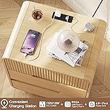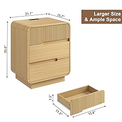 YKVIQBY Nightstand with Charger Station & Safe Curved Edges, Modern Fluted Night Stand with 3 Storage Drawers, Wood Bedside End Tables for Living Room/Bedroom, Space Saving, Natural Oak
