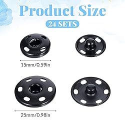 Package Contents: You will receive 24 sets of sewing snaps, covering 2 practical sizes: 15mm and 25mm. There are 12 sets of each size, available in black and silver. The ample quantity is sufficient to meet various daily sewing and repair needs Superior Material: The large sewing snaps are made of high-quality copper alloy, with a smooth surface, comfortable touch, and a sturdy, durable texture. They offer excellent rust resistance, are not prone to fading, breakage, or deformation, and are long-lasting Suitable Size: The sewing snap set comes in two sizes. The 15mm size is small and delicate, suitable for lightweight clothing, and offers good concealment. The 25mm is the standard large size, with stronger load-bearing capacity, suitable for heavier clothing Easy to Use: Each set of snaps consists of only two parts, front and back, with a simple structure, making it easy to sew by hand. The snaps fasten smoothly and stay securely in place once closed, creating a natural, snug fit Versatile applications: This large sewing snap set is suitable for sewing and repairing various garments such as coats, windbreakers, jeans, shirts, hats, and shoes. It can also be used for DIY projects such as backpacks, belts, crafts, and fabric accessories