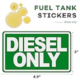 Practical Function: This sticker features a striking green color with clear "Diesel Only" lettering, providing you with an intuitive visual reminder. It effectively helps prevent engine damage caused by fuel errors, thereby ensuring the overall safety of your vehicle Reliable Material: Made from high-quality vinyl, the sticker boasts exceptional weatherproof properties to withstand high temperatures without cracking or fading. Its outstanding wear resistance ensures it maintains its sleek appearance and reliable performance over time Reflective Design: This sticker features a reflective design, ensuring it remains clearly visible at night or in low-light conditions. It provides a reflective effect when illuminated by vehicle lights, allowing for easy reading and quick identification of the fuel type while enhancing driving safety Easy Installation: With a self-adhesive backing, this fuel identification decal is incredibly easy to install with no extra tools required. Simply clean and dry your desired position, peel off the adhesive backing, align the decal, and press firmly to ensure a secure fit Wide Application: Measuring 5 × 3 inches, this decal is widely applied to fuel tanks, gas caps, and fuel filter areas. It is suitable for various diesel-powered vehicles, including semi-trucks, pickup trucks, motorcycles, RVs, and boats, serving as an effective reminder
