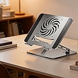 Enhanced Cooling System: The laptop stand aluminum heat dissipation and 3D ventilation design ensures stable performance as a laptop cooler, preventing thermal throttling during extended use for work or entertainment purposes, offering reliable temperature control in any setting Neck Relief with Flexibility: This adjustable desk provides height options for an ergonomic laptop setup, ensuring neck relief and enhanced comfort when typing or viewing content in various environments such as offices or home workspaces Durable Carbon Fiber Build: The laptop riser is from high-quality carbon fiber, ensuring a robust and long-lasting desk stand that supports up to 17-inch laptops with ease, providing stability while elevating your device for ergonomic comfort during extended work periods Space-Saving Foldable Stand: This foldable laptop is designed with an a-hand open mechanism, ensuring easy setup and storage; its ultra slim profile when folded makes it a compact desk accessory, offering a practical solution for travelers and professionals seeking efficiency without compromising work area organization Flexible Orientation Support: With its ability to hold and laptops securely, this adjustable laptop holder simplifies work area organization, offering reliable support for switching between portrait and landscape views, ideal for creative projects or multitasking environments