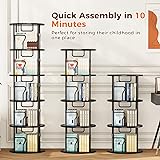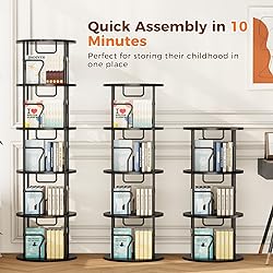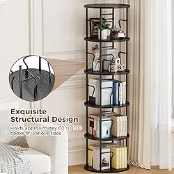 【360° Rotating Convenience】This rotating bookshelf is made of ultra-smooth steel turntable, which can be smoothly rotated 360° for easy access to books and decorations. The rounded corners design is safer unique styling design is both functional and artistic, and enhances the overall aesthetics. Keep everything within reach 【Durable Build for Versatile Use】Made of thick P2 MDF and a sturdy metal frame, this revolving bookcase is built to last. With four compartments on each shelf, you can easily store books of all sizes in an organized manner. Ideal for use as a bookshelf, storage shelf or display shelf in any room such as a den, bedroom, living room or even a game room 【Compact Design, Massive Storage】This 5-tier spinning bookshelf holds 80-100 medium-sized books, and its multi-tier and rotating design maximizes space in your home! Its sleek, space-saving design (17.56 “D x 17.56 ‘W x 62 ’H) keeps your home tidy while adding a stylish touch, and this bookshelf is available in a variety of styles and sizes 【Customizable & Easy to Assemble】Assemble the rotating bookcase in just 20 minutes, clear assembly instructions and labeled parts make assembly a breeze, and the multi-tier design allows you to adjust the number of tiers you assemble to suit your needs 【Lifetime Quality Assurance】Enjoy peace of mind with our lifetime warranty. Every bookshelf is rigorously inspected before shipping, ensuring top quality. Have a question? Our 24/7 customer service team is ready to help