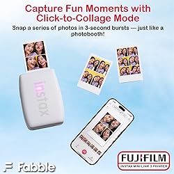 SEAMLESS SMARTPHONE PRINTING: The Fujifilm INSTAX Mini Link 3 lets you easily print 2x3” photos directly from your smartphone printer. Whether you’re using iOS or Android, you can wirelessly connect via Bluetooth 5.1 and quickly transform your digital memories into beautiful, high-quality prints in just 15 seconds. ENHANCE YOUR PHOTOS with 3D AR effects using the Instax AiR Studio App. Save up to 20 creations, print later, or capture videos. Your studio, your way. Download the free Instax mini Link App now THE INSTAX MINI Link 3 effortlessly brings your smartphone photos to life. Whether it's a new snap or a cherished memory from your camera roll, this sleek printer keeps your moments alive. Just add Instax mini instant film! ELEVATE YOUR IN-APP photo booth game with the Click to Collage feature! Capture six images in quick succession, choose your favorites, and print a stunning Instax mini collage. Plus, enjoy a fun animation of all six shots, perfect for sharing. Stock up on Instax mini film for your Link 3 Smartphone printer! UNLEASH YOUR CREATIVITY with the INSTAX MINI LINK 3 Smartphone Printer. Using the free app, you can print 2x3” photos from your iOS or Android device via Bluetooth. Customize your shots with text, frames, filters, and stickers, or add 3D AR effects with the INSTAX AiR Studio feature.