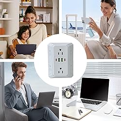 Multiple Ports Expansion: The outlet extender six AC outlets and USB charging ports, eliminating the need for plug swapping while enabling simultaneous device power in residential or office settings, ensuring seamless connectivity for all your devices Smart Fast Charging: The wall outlet extender intelligent current detection to enable rapid charge support, ensuring efficient power delivery for your devices like phones and tablets, making it ideal for busy workspaces or home offices where time is critical Desk Space Saver: Designed with a wall-mounted and angled socket arrangement, this outlet with USB ports minimizes desk space usage while streamlining cable management, providing convenience in busy kitchens or home offices Durable Heat Resistance: Built with heat-resistant and equipped with an anti-shock structure, this wall outlet delivers enhanced safety protection through smart features like overload prevention and auto power cutoff, ensuring secure use in areas such as bedrooms Effortless Mobility: A wall outlet with USB ports for modern travelers, equipped with a North American plug for versatile use in professional or personal settings, its travel-friendly nature allows easy storage in bags, keeping your gadgets charged during commutes
