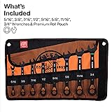 EIGHT SAE HEX SIZES: Ratcheting wrench set includes 5/16, 3/8, 7/16, 1/2, 9/16, 5/8, 11/16, and 3/4-Inch sizes, ideal for various applications SLIDE LOCK: Prevents fasteners from slipping through by firmly gripping the back of nuts and bolts 90-TOOTH RATCHET: Wrench provides maximum access with a minimized arc swing and a 20-Percent improvement over 72-Tooth ratchets PASS-THROUGH CAPABILITY: Pass-Through ratchets for working on longer thread PREMIUM ROLL-POUCH: Designed to keep tools secure, organized, and easily accessible for convenient storage and transport