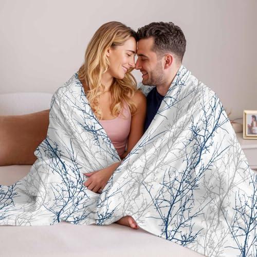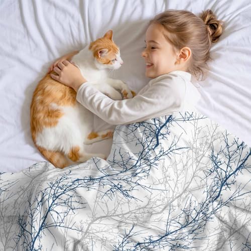Flannel Fleece Throw Blanket, Blue Gray Tree Branch on White Soft Warm Fuzzy Cozy Blanket for Couch Bed Sofa Office Botanical Seamless Plant Texture 60x80In