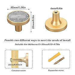 STRONG MATERIAL: Cabinet pulls are made of zinc alloy, with fashionable and bright patterns printed on the surface, making the cabinet door knobs rust and corrosion-resistant, ensuring durability. SIZE: Heavy round cabinet knobs measure 1-1/4 inches (32 mm) in diameter at the top, 0.6 inches (4 mm) in diameter at the bottom, and protrude 0.9 inches (23 mm) from the cabinet door or drawer front. EASY INSTALLATION: Cabinet door knobs have a single hole that easily installs into pre-drilled holes with mounting screws. 4 cabinet knobs include 4 short 0.86 in. screws and 4 1.18 in. expansion screws. WIDE RANGE OF APPLICATIONS: Gold cabinet knobs with vibrant patterns are designed with soft, clean lines to bring a sophisticated look and high-quality touch to kitchen cabinet doors and drawers, bathroom and laundry room cabinets. TWO KINDS OF SCREWS: equipped with two kinds of screws, 2.2cm length ordinary screws, can be used for drawers, cabinets, 3cm length expansion screws, can be nailed to walls, tiles and other wall surfaces, to do decorative, hooks to use.