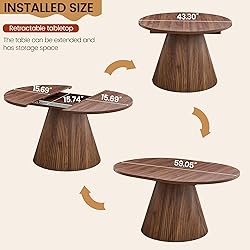 - Boasting a versatile and expandable design, this dining table effortlessly transforms from a compact 43.3-inch round table to a spacious 59” x 43.3” oval using removable leaves that store neatly underneath. Its mid-century fluted design complements various decors, while the sturdy MDF construction and heavy-duty pedestal base ensure lasting stability. The practical, scratch-and-water-resistant surface is easy to maintain. Perfect for dining, work, or crafts, it includes clear instructions for easy assembly and is backed by dedicated customer support.