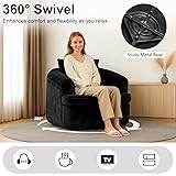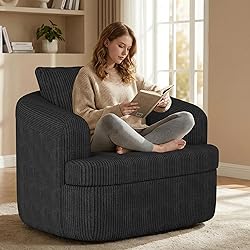 【360-Degree Rotation】This Swivel Barrel Accent Chair features 360-degree rotating base, offering a smooth and quiet rotation experience, easily adapting to different interaction needs. Whether you're working, relaxing, or chatting with friends, you can easily adjust your sitting position without having to get up. 【Selected Fabric】The Corduroy Swivel Chairs is crafted from luxurious and trendy corduroy fabric that is soft and comfortable. And the seat cushion is padded with high-density foam for excellent resilience, sitting for a long time without collapse. Specially designed with spring pockets to promote proper posture and reduce fatigue during long sits. 【Ergonomic Design】This oversized comfy chair for living room features an ergonomic design with wraparound backrest and curved armrests, providing exceptional comfort and support. You can sit cross-legged easily to play games, or curl up in the chair to watch TV. The included pillow provides added support and comfort. 【Easy Installation】Our black swivel chair is vacuum-packed. After unpacking, allow the foam to fully expand for 48 hours. Just install the swivel base and you are ready to use. Overall dimensions: 36.6"W x 34.6"D x 32.2"H, weight capacity: 300lbs. 【Versatile Use】This boneless chair for living room exudes a modern and stylish vibe, blending perfectly with any decor style to create a cozy reading nook. It's ideal for bedrooms, living rooms, studies, offices, apartments, dorm rooms, and more.
