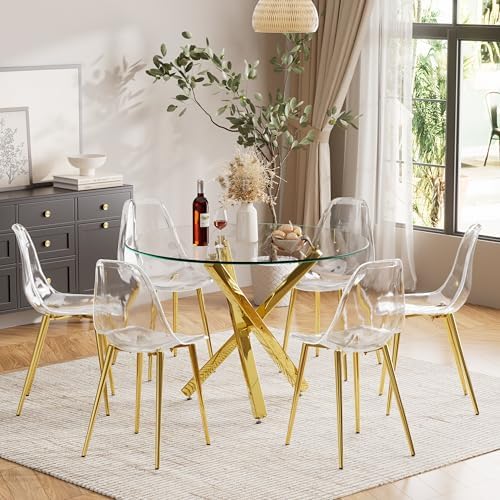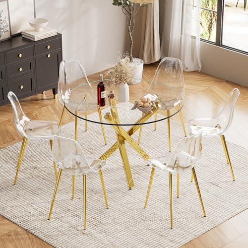 Baysitone 39-Inch Round Dining Table Set with 6 Clear Dining Chairs, Glass Table with Cross Metal Legs, Plastic Seat with Metal Legs, Easy Assembly Kitchen Set for Apartment, Dining Room, Home(Gold)