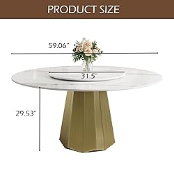 MODERN STYLE: The modern round dining table is equipped with a marble-textured white sintered stone tabletop and a gold base, giving it a sophisticated and elegant appearance EASY TO MAINTAIN: The modern kitchen tabletop is made of unique sintered stone material, which offers better scratch resistance and resistance than marble dining tabletop. It is also waterproof and easy to clean with a damp/wipe cloth STRONG BASE: The modern kitchen made of gold stainless steel pedestal with unique design to provides stability and strength SPACIOUS TABLETOP: Enjoy ample space for the 59" round dining table, it designed to comfort accommodate 6–8 person, the generous tabletop area allows for easy movement and placement of dishes, making mealtimes more enjoyable EASY ASSEMBLY: Get your dining room table up and running in no time with our straightforward assembly process. It only needs to screw the base to the tabletop that finished and enjoy it!