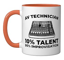 - Perfect gift for the tech expert who enhances audio and visual experiences. Show your passion for technology with our AV equipment, enhancing audio and visual experiences for any event. Equip them with the latest AV equipment for every event. This design makes a great birthday or christmas present. This design reads: "Av Technician 10 Talent 90 Improvisation".