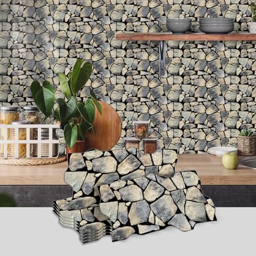 TONSHEN 12 Sheets Peel and Stick Backsplash Wall Tiles, 11.8in x 5.9in PVC Waterproof Self-Adhesive Marble Look Wall Tiles for Kitchen, Bathroom (Yellow Stone)