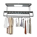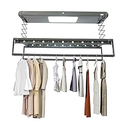 - Engineered for the modern home, this electric retractable airing rack combines sleek style with practical functionality. Crafted from high-class materials for long-lasting use, it frees up valuable floor space to help maintain a tidy and organized home. Experience more convenience—make the product for your home today!SpecificationColor: GrayMaterial: Carbon Steel, Aluminium Alloy Process: Electrostatic Spraying Style: ModernInstallation Required: YesMounting Type: Ceiling MountLighting Type: LEDVoltage: 110V(Wiring)Power: Lighting: 24WRemote Control Distance: 20m/65.62 ft(Without Wall)Overall Load-bearing Capacity: 35kg/77.16 lbsClothes Airing Pole Adjustable Length: 130-215 cm/ 51.18-84.65 ftClothes Airing Rack Width: 56 cm/22.05 inRetractable Height: 110cm/43.3 inHost Size: 125 *31*7cm/49.21 *12.2*2.76 inPackage Size: 138*37*21.5cm/54.33*14.57*8.46 inGross Weight: 11 kg/24.25 lbsNet Weight: 10kg/ 22.05 lbsPackage Included1* Electric Retractable Airing Rack1* Remote Control 1* English Instruction ManualOther Accessories for AssemblyNotes1. Please use the product within its weight capacity to avoid damage.2. Please note that the product does not include other items.3. It is recommended that the balcony size suitable for installation of this product: balcony width ≥3.12 ft, balcony length ≥4.27 ft, balcony height not higher than 9.19 ft. If the balcony has an inner door/inner window/to the top closet, etc., the upper edge should be more than 5.12 in away from the roof to avoid bumping.
