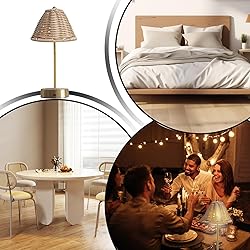 Versatile Room Lighting: With its natural aesthetic decor appeal, this vintage lamp provides warm ambient lighting suitable for multiple rooms, blending modern retro design elements to enrich the ambiance of living spaces, bedrooms, or dining areas, delivering adaptable illumination that suits diverse interior styles while maintaining a harmonious and inviting atmosphere throughout your home Cord-Free Portable Design: The rattan table lamp features a rechargeable battery, flexible placement without the restriction of cords, perfect for bedside reading or as a USB charging nightlight in any room, offering convenience and versatile lighting options for indoor use Adjustable Brightness Levels: The rechargeable table lamp features 3-level dimming , enabling users to adjust brightness for task and mood lighting needs, providing warm reading light while enhancing ambiance control in living rooms or bedrooms for ultimate comfort and relaxation Reinforced Rattan Shade: The cordless table lamp combines a long-lasting rattan shade safety-designed lighting, offering reliable performance and aesthetic appeal for comfort family spaces like dining areas or bedside tables Artistic Ambient Glow: With cordless lamps rechargeable flexibility and intricate hand- rattan decor, this artistic table lamp acts as an eco-friendly home accent highlighted by matte metal accents, delivering double function lighting perfect for dining spaces or relaxing evenings on the porch