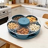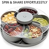 Effortless Sharing with Rotating Design: The Divided Spin and Snack Serving Tray features a rotating design, making it a perfect spinning snack tray for parties or casual gatherings. Simply twist the tray for easy access to snacks and share them with friends and family. Multi-Compartment Organization: This snackle box container includes five separate compartments, providing a multi-compartment food organizer for different snacks. Keep fruit, nuts, candy, and more fresh and organized in one convenient snack box container. Portable and Practical: The Portable Travel Snackle Box is compact and easy to transport, making it a must-have for picnics, outdoor events, and road trips. This snack tray with lid ensures your snacks stay secure and organized while you're on the go. Sturdy and Stable: Equipped with non-slip feet, this round snackle box remains stable on kitchen counters, dining tables, or patios. The divided tray with lid prevents any spills, keeping your snacks neatly in place during your gathering. Stylish and Space-Saving Serving Solution: This round serving tray is a perfect addition to any party setup. Whether you're hosting a movie night or a family gathering, the snack spinner allows for easy serving and storage, enhancing your serving trays for party experience with a sleek, compact design.