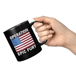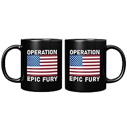 - OPERATION EPIC FURY MUG: Drink to a better future for the world. .Double Sided American Flag mug with the patriotic slogan Operation Epic Fury. Support America. Patriotic mugs. Pray for peace and a better world thanks to American action. IMAGINE HOW GREAT YOU WILL FEEL: Drinking out of this unique mug or just showing it off. A memorable gift, unique conversation piece and attention grabber! Show where you stand with this cool mug. AMERICAN QUALITY: Ceramic mug is microwave safe and dishwasher safe. Authentic Brian Bula design printed in USA. PERFECT SIZE: Standard 11 ounce mug. 3.75 inches high, 3.15 inches diameter. Perfect coffee mug or cup. Easy and comfortable to hold rounded C-shape handle.