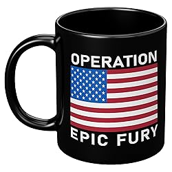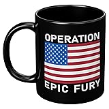 OPERATION EPIC FURY MUG: Drink to a better future for the world. .Double Sided American Flag mug with the patriotic slogan Operation Epic Fury. Support America. Patriotic mugs. Pray for peace and a better world thanks to American action. IMAGINE HOW GREAT YOU WILL FEEL: Drinking out of this unique mug or just showing it off. A memorable gift, unique conversation piece and attention grabber! Show where you stand with this cool mug. QUALITY: Ceramic mug is microwave safe and dishwasher safe. Lead free. BPA free. Suitable for everyday use. Print does not fade or peel. Handle is comfortable to grip. PERFECT SIZE: Standard 11 ounce mug. 3.75 inches high, 3.15 inches diameter. Perfect coffee mug or cup. Easy and comfortable to hold rounded C-shape handle. MADE WITH PRIDE IN AMERICA: Design by California artist. Blank mug sourced from China and printed in USA. Mugs take about 3 working days to finish in an automated non-cancellable process.