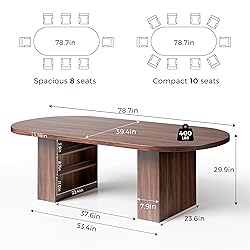 - This modern oval dining table measures 78.7"L x 39.4"W x 29.9"H, seating 6-10 people comfortably. It features three open shelves at each end for convenient storage, keeping essentials organized and tabletop clutter-free. Built with a 1.18-inch thick wood-grain tabletop, sturdy steel frame, and heavy-duty base, it supports up to 400 lbs. Stylish, durable, and versatile, it works as a dining table, desk, or gathering centerpiece.