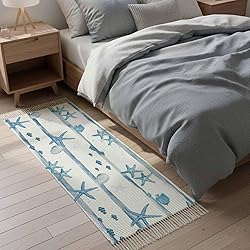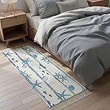 Kitchen Runner Rugs, Summer Ocean Starfish Shell Fish 2'x4' Throw Rug with Tassels, Watercolor Blue Stripes Washable Soft Floor Carpet Runner for Hallway Bedroom Bathroom Laundry Room