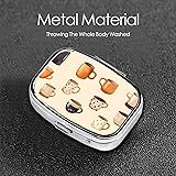 Pill Case for Purse: 2.2x1.6x0.7 inches, fits pockets or purses for easy portability Durable Build: Electroplated metal construction with premium finish resists daily wear 2 Compartment: Two separate sections plus a convenient built-in mirror Secure Snap: Sturdy button keeps contents safely closed, preventing spills or openings Small Pill Organizer: Compact pill organizer keeps medications neat at home or on the go