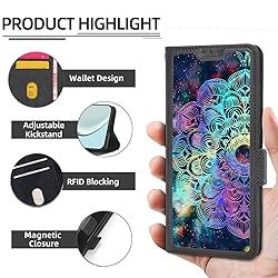 It is supported by advanced RFID blocking technology to block signals and protect your personal information effectively Can stand the phone up to watch something hands-free High quality PU leather, very light, it have card slots, can be put into cards and money Magnetic flap to keep it closed and protected, secure magnetic closure Frosted surface, delicate feel, Colorful Reflect Light