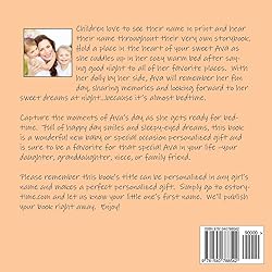 - This book is uniquely original and can be personalized with any girl's name. How fun is that? Over 500 book names already published on Amazon! Think of the possibilities: baby or shower gifts, birthdays, a special something from grandma, and more. You can purchase the book's title as shown (this book is in AVA'S NAME), OR you can request a new book be published in the name you desire. It's easy to order in 3 steps: 1. Go to estorytime.com BEFORE placing your Amazon order to let Melissa know the name you want personalized on your book. 2. Click on the "Personalize It" tab and add the name and book title you would like. Send this information to Melissa. 3. Melissa will take care of the rest. She will publish your new book title on Amazon, and once published, will get a link from Amazon to email to you. Once you receive this link, you can order your book just like any Amazon product. Easy! We've taken the worry out of the process and your child will be thrilled with the final product. Who doesn't like to see their name on the cover or hear it related throughout the story? The author, Melissa Ryan, is the mother of five children and knows the importance of reading to your little ones. It instills a love of books and fosters an active imagination in the youngest of readers. Help start them on a path of discovery with Melissa's stories. The tale of Ava is perfect for bedtime, especially when unleashing the child’s wonder by using her own name. This is a book that can be enjoyed over and over again, and will be remembered long after the last page is read and the lights turned out. Goodnight Ava and the Moon is beautifully illustrated with full color images that will hold your child's attention while you read the delightful story. Walk along with Ava through a day of happy smiles, sleepy-eyed dreams, and a bedtime that’s sure to please. She will capture your heart, and the moments spent reading it together will build fond memories that will be cherished throughout the years. This is just one of several books offered by Melissa in her ever-expanding children's book series. You'll learn to love and appreciate the extra attention that goes into each volume. Special care is taken to keep the child's heart at the center of each story, helping them build character and learn something along the way. Help that special child in your life reach for the stars, and let Goodnight Ava into your home to cast a moonbeam over the most precious of your possessions. Build a binding relationship with the power of reading...you'll look back in awe at the foundations you've built. Please customize and purchase this book for a special little girl in your life today. Tags: Ava, personalized children’s books, personalized gifts, personalized baby gifts, personalized, bedtime stories, bedtime story, 1st birthday gifts