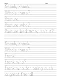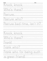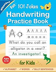 - Learn to Write Letters, Numbers 1-100, Sight Words and 101 Jokes, Tongue Twisters Workbook for Grades 1, 2 & 3This is a beginning handwriting book to help kids ages 6-8 learn to write with complete step-by-step instructions. Based on modern learning techniques and supported by playful drills, this tracing book is the perfect starting book to give your kid a preschool head-start with 100+ pages of tracing practice. It is organized in a progressively skill building way for kids to develop confidence to write neatly and improve penmanship.This Learn to Write Letters, Numbers 1-100, Sight Words, 101 Jokes Workbook is divided into the following parts:Part 1: Learning the Alphabet:Trace and practice letters a-z and A-ZPart 2: Writing Sight WordsPart 3: Writing Numbers & Number Words from 1 - 100Part 4: Writing Knock Knock Jokes in a smaller letter sizePart 5: Writing Jokes and Tongue Twisters: Trace the illustrated jokes and tongue twisters and try writing them on your own. Share the jokes with friends and family for more laughs!This fun-filled handwriting practice book will progressively build your child's skills and develop confidence to learn through the 100+ high quality pages On Sale under $10 - Buy today to begin the fun journey into the world of writing penmanship.