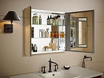 Aluminum This bathroom wall cabinet includes two adjustable tempered-glass shelves offering additional bathroom storage This KOHLER recessed medicine cabinet with mirror has double doors with full-overlay beveled mirrors This bathroom wall storage cabinet features a mirrored interior This mirrored medicine cabinet has two-way adjustable hinges with 108° opening capability for easy cabinet access This medicine cabinet mirror includes a side mirror kit for surface-mount installation Anodized aluminum construction with a durable rust-free and chip-free finish 2 adjustable tempered glass shelves Mirrors on back of door and interior back of cabinet Includes mounting hardware for surface or recessed installation Reversible for left or right hand opening