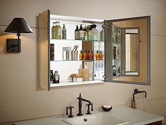 - This medicine cabinet with mirror showcases a sleek mirrored surface inside and outside. Designed by Kohler, the frameless unit presents two front doors with 1/2-inch bevels that join visually as one expansive mirror, fitting effortlessly into any bath or powder room for homeowners and DIYers focused on an organized daily routine. The wall-mounted bathroom storage cabinet includes adjustable interior glass shelves.