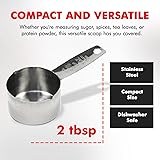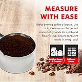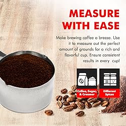 Durable and attractive stainless steel construction for longevity As with any other standard coffee measure, put one scoop in for every cup of water to make a perfect cup of coffee. Adjust per individual taste. Short and maneuverable handle fits into your bag or bin of coffee easily Other uses include measuring sugar, spices, tea, pet food and more Dishwasher safe for easy cleaning