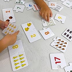 30 PUZZLE PAIRS: This bright collection of two-piece puzzles aimed at children ages 3 and up is a perfect introduction to jigsaw puzzles. Designed to introduce counting and encourage early math skills, the colorful illustrations help your child learn to count in a relaxed and fun way. IDEAL PREPARATION FOR SCHOOL: The puzzles are a perfect introduction to the early math skills they will encounter at school. They also strengthen the child’s developing concentration skills and build focus, which will help them with the transition into education. IMPROVE MOTOR SKILLS: Thick, durable cardboard construction makes cards easy to grasp and use, and also a great way of improving hand-eye coordination and encouraging the development of essential motor skills. DEVELOP EARLY MATH SKILLS: The fun puzzle pairs make it easy and fun to develop mathematical abilities and practice counting skills. This is a fun way to introduce the idea of counting. BOOST CONFIDENCE and SELF-ESTEEM: The combination of pictures and numbers makes the puzzles an ideal way to encourage and boost confidence in young children. The self-correcting puzzle pieces means that only the correct pieces fit together. This means that they get the puzzle right every time, making it ideal for both independent play and playing together.