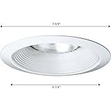- Long neck 6" Baffle trim in a White finish. Baffle is one-piece construction with integral matching bright white power painted metal flange. UL & CUL listed for damp locations. 7-3/4" outside diameter.