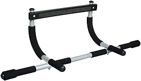 - Iron Gym Total Upper Body Workout Bar. Heavy duty steel constructionStrengthen your back, biceps, and other upper body muscles in the comfort of your living room or dorm with the Iron Gym workout bar. Designed to fit conveniently in most doorway frames or sit on the floor for pushups, dips, and sit-ups, the Iron Gym is an ideal choice for people who want to get fit without buying expensive, space-intensive weight sets. When installed in the doorway, the device lets you perform pull-ups and chin-ups, with three grip positions-narrow, neutral, and wide-for working the inner and outer back. Once you're done with your back workout, you can quickly move the Iron Gym to the floor, where you can perform pushups while facing down, tricep dips while facing the other way, or sit-ups using the Iron Gym for foot stability. The Iron Gym-whose durable steel frame installs quickly without tools or fasteners-holds up to 300 pounds and is designed to fit residential doorways 24 to 32 inches wide, with doorway trim or molding up to 3.5 inches wide.