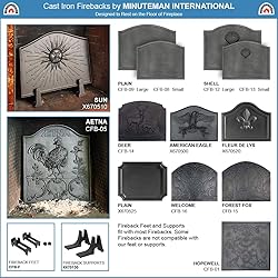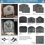 Measures 19-1/2-in W x 15-1/2-in H Made of Cast Iron with Matte Black finish Decorative firebacks protect the firebox wall and radiate heat back into the room This fireback may be used directly on the hearth floor, or with feet if additional height is desired Use Minuteman International Fireback Supports (X670130) or Fireback Feet (CFB-F)
