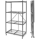 Thoughtfully Designed 4-Tiered Storage: Innovative Origami foldable shelving rack made of commercial grade powder-coated steel provides a heavy duty multi-functional solution perfect for all your storage needs Quick & Easy Assembly: Completely pre-assembled with no tools, assembly, or significant time required; Simply unfold, flip the top shelf, latch, and it's ready to use in 20 seconds Convenient Rolling and Folding Design: Shelving unit includes 4 professional grade caster wheels for easy mobility (2 wheels feature smart-lock function); Folds flat for easy portability and storage in your garage, closet, under your bed, or behind doors Ample Size for Home Decor or Bulky Items: Overall dimensions: 36" W x 21" D x 60" H; Folded dimensions: 3.5" W x 21" D x 61.75" H; Distance between shelves: Approximately 17.5" H, 17.5" H, 19" H (Bottom to Top) Impressive Capacity: Wire shelves allow airflow so you can stack and store items in your office, kitchen, garage, and laundry room; Capacity with wheels: Approximately 75 lbs per shelf (225 lbs total); Capacity without wheels: Approximately 250 lbs per shelf (750 lbs total)