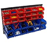 VERSATILE ORGANIZATION BINS - Use these garage storage bins in numerous areas of your home. This wall storage unit works for garage organization as a hardware organizer, in playrooms as a plastic blocks organizer, and in craft rooms as a small parts organizer. EASY ACCESS - Each tool organizer has an open design, so you can reach in to grab what you need without removing it from the panel board. These organizer bins also remove and attach to the peg panel board seamlessly for fuss-free loading and unloading. SIMPLE MOUNTING - Hang the black peg panel board base virtually anywhere in your garage, craft room, or workshop thanks the flat, streamlined design. The special design lets bins sit on the board in various configurations for custom garage storage. EASY CLEANING - Trust in the smooth plastic construction to help these workshop, craft room, and garage hardware organizer bins to effortlessly endure frequent handling. The smooth surfaces allow fuss-free wipe-downs for easy cleanup as needed. PRODUCT DETAILS: Materials: Plastic. Dimensions: (L) 25.25" x (W) 14.875" x (H) 7.125"; Black Peg Panel Board: (L) 25.25" x (W) 14.875" x (H) 0.625"; 18 Red Bins: (L) 3.875" x (W) 3.625" x (H) 2"; 12 Blue Bins: (L) 4" x (W) 6.375" x (H) 2.875".