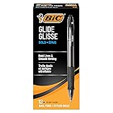 One 12-count pack of BIC Glide Bold Black Retractable Ballpoint Pens Thick 1.6mm bold point pens create broad, vivid lines, great for everyday writing at work, school or home Black ballpoint pens with proprietary ink technology for an ultra-smooth writing experience Retractable pens with easy one-click operation and comfortable grip for extra control Reliable black pens for office or school supplies