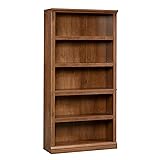 - This 5-shelf bookcase from the Sauder Select collection is the ultimate home organization tool. Featuring five spacious shelves, this tall bookcase has room for a variety of home office supplies, from file boxes to binders. These large shelves make a great place to store and display kitchen pantry items like cereal boxes or dishes. This living room bookcase will be assembled in no time with the patented slide-on moldings. It includes three adjustable shelves for flexible storage and display of family keepsakes and collectibles. Use this engineered wood bookcase in the bathroom to store cosmetics, linens, or baskets of toiletries. It could be the perfect vertical storage unit for arranging art supplies in a craft room or keeping laundry soaps and fabric softeners organized in the utility room. Finished in elegant Oiled Oak, this stylish display bookcase could also be used for entertaining purposes, providing the perfect organization tool to display bottles, glasses, and a collection of swizzle sticks. Stack it, store it, or style this versatile, vertical storage solution.