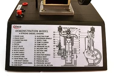 Functioning Parts: Crankshaft, cam, cam gear, connecting rods, piston, intake/exhaust valves, rocker arms, push rods, fuel pump. Ignition light and glow plug can be activated by using a 6V power supply Identifiable parts: Crank Case, Crank Shaft, Connecting Rod, Cylinder, Piston, Intake Valve, Exhaust Valve, Pestle Shaft, Glow Candle, Swing Lever, Exhaust Manifold/Pipe, Cam Shaft Gear, Injection Pump, Governor Spindle, Supply Line, Cylinder Pump, Piston Pump, Pressure Vale, Delivery Pipe, Suction Sub, Air Filter, Injection Nozzle, Nozzle Body, Nozzle Needle, Pressure Bolt, Pressure Socket, Oil Return Turn the hand crank on this model and you will see all the functioning stages of a 4 stroke diesel motor Made of cast alloys and abs plastic, built for years of demonstrations