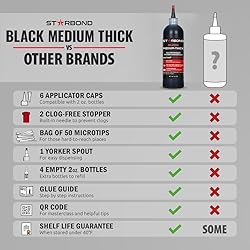 ✅ CA REFILL SYSTEM FOR CONTINUOUS WORK: Built for makers who go through CA glue regularly, this 16 oz Refill System sets up a bulk refill bottle + bench bottles workflow. Keep a ready-to-use bottle at your bench, refill anytime, and avoid stops from clogs or running out. ✅ RUBBER-TOUGHENED FOR IMPACT RESISTANCE: Reinforced with rubber to absorb shock and resist cracking where standard CA glues fail. Ideal for knot fills, joints, and repairs exposed to vibration or light flex—perfect for guitars, inlays, jigs, and woodworking tasks. ✅ MEDIUM-THICK VISCOSITY + BLACK FINISH: Motor-oil viscosity CA glue delivers strong bonds with smooth, controlled flow. Wicks into tight cracks and fills small-to-medium gaps, while black pigment blends into walnut, ebony, and other dark woods. ✅ WORKFLOW-READY SUPPLIES INCLUDED: This kit goes beyond spare nozzles. Includes a Yorker spout for clean refilling, 4 empty bottles for daily-use bench setups, 6 applicator caps, 2 anti-clog stoppers, and a bag of micro-tips for precision cracks and hard-to-reach areas. Designed to keep your glue flowing and your projects moving. ✅ SATISFACTION GUARANTEED: With 35+ years of trusted performance (since 1988), Starbond delivers the consistency makers expect. Backed by a 30-month shelf life warranty when stored under 40°F, our CA glue resists clogs and hardening. We stand behind our adhesives with a 100% satisfaction guarantee.
