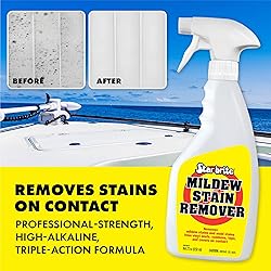 Quickly removes mold stains & mildew stains on contact without heavy scrubbing; EASY TO USE - spray, wait until the stain disappears, then rinse STAIN REMOVER + CLEANER: High-alkaline, triple-action formula contains; BUFFERED-BLEACH to remove mold stains & mildew stains; CHELATING AGENTS to lift ground-in dirt; SURFACTANTS to cut grease & grime BUFFERED-BLEACH TECHNOLOGY is better suited for marine/outdoor upholstery and outdoor acrylic fabrics including Sunbrella; Won't harm stitching or threads More effective cleaning power than unbuffered "bleach-water" based products, or diluted supermarket brands Works on; awnings, fiberglass, wood, concrete, drywall, siding, tile & grout, gutters, roofs, vinyl upholstery, most outdoor acrylic fabrics, and more (test fabric for colorfastness before use) Professional-strength, concentrated formula for boats, homes, RVs, and commercial use Star brite products are proudly made in the USA since 1973