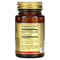 ESSENTIAL COPPER: Copper is an essential trace mineral that supports connective tissues like bone, skin, tendons as well as cartilage. It is also essential in the formation of collagen BIOAVAILABLE: The formulation in these tablets provides a patented, highly bioavailable form of chelated copper KOSHER, GLUTEN FREE & SUITABLE FOR VEGANS: These tablets are KOF-K Kosher certified, are non-GMO and are certified gluten free. They are free of: gluten, wheat, dairy, soy, yeast, sugar, and sodium. They are also free of artificial flavors, sweeteners, preservatives and colors The Gold Standard: For over 70 years, Solgar has been committed to quality, health, and well-being. Our mission is to create the finest nutritional supplements in small batches, through tireless research, using only the finest raw materials