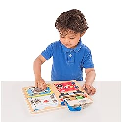 Wooden skills activity board featuring doors to open, close, and explore Each hinged door fastens with a different lock or latch Artwork under doors highlights familiar places and intriguing scenes Sturdy wooden board with metal hardware and hinges; no loose pieces; encourages fine motor skills, hand-eye coordination, and problem-solving skills Makes a great gift for girls and boys, ages 3 to 5, for hands-on, screen-free play