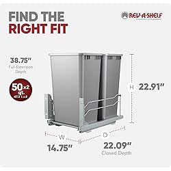 Maximize Your Space : Maximize space and get your trash off your floor and hidden in your kitchen cabinets with these double pullout waste containers; Designed for easy access keep your home neat and trash out of sight Specifications : Dimensions (W x D x H) : 14.75" x 22.09" x 22.91"; Weight: 23.55 pounds; This pullout trash system is designed for a cabinet opening width of 15-18 inches; Minimum cabinet opening width for face frame/ frameless is 15"W x 22.09"D x 23.5"H Complete Access : This system mounts to the cabinet floor and features an undermount soft-close full-extension concealed slide system; Waste Containers fully extend outside of the cabinet for easy access to the rear storage Includes : (2) 35-quart waste containers, (1) metal frame, and (1) pair of slides; Adjustable door-mount brackets are included and required for operation; Mount the cabinet door to the unit to complete installation Rev-A-Shelf Difference : A global family-owned company offering holistic, convenient, stylish, and smart organization and storage solutions for kitchens, baths, closets, and whole homes since 1984