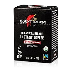 INSTANT COFFEE THAT DOESN’T TASTE LIKE IT: When you need that coffee-flavored boost and you need it quickly, Mount Hagen instant coffee singles are the answer. Our advanced freeze-drying process retains the deep coffee flavors and aromas of the fresh Arabica beans, resulting in a wonderfully smooth coffee with a rich, full-bodied taste- even if you’re miles from the nearest coffee store! Plus, our instant coffee dissolves beautifully in cold water too! CONVENIENT SINGLE-SERVE STICKS: Our pocket coffee packets mean you can take good coffee wherever you go. Pop our instant coffee packets into your backpack, briefcase and office desk to ensure you can get your coffee fix when you need it. With Mount Hagen’s 2 Pack, 25 single stick packets, all you need is hot water and you have 50 cups of flavorful coffee on the go. Convenient and easy, these pouches save you from lugging bulky equipment, and better yet- you get to skip on cleanup too! AWARD-WINNING: Mount Hagen consistently tops lists of best instant organic coffees, becoming many a connoisseur's favorite joe-on-the-go. (Google it, and you’ll see!) Whether you’re on the go, at the office, or on a mountaintop, don’t settle for any less than the best. These single-serve sticks are packed with the same outstanding coffee as our award-winning jars- made from 100% USDA Organic, Fairtrade Arabica beans and also gluten-free and certified OU Kosher. MASTERS OF OUR CRAFT: A sip of our balanced, smooth instant coffee is a taste of its history in the lush mountains around Mount Hagen, Papua New Guinea. Since 1986, we’ve been perfecting our brew so you can enjoy its naturally mild taste with low acidity and no bitterness, whenever you want and wherever you are. MOUNT HAGEN: The trailblazer of organic Fair Trade coffee production, we pride ourselves on coffee that not only tastes good but DOES good too. Every granule of our organic Fair Trade coffee is planted, cultivated, harvested, processed and packaged by workers being paid fairly and respectably; families thriving on the infrastructure we provide; and communities gaining the power of education, health and hope. Scroll up, click buy now and support their future.